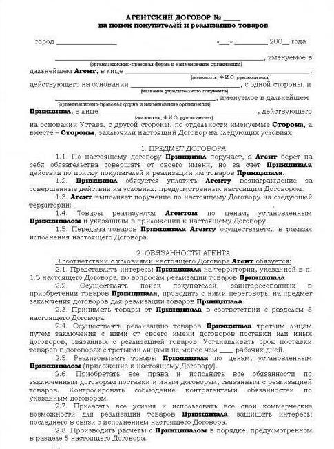 Dans le contrat d'agence, vous devez comprendre le type de contrat de droit civil qui régit les relations entre l'entrepreneur et le client. Selon le paragraphe 1 de l'art. 1005 du Code civil de la Fédération de Russie, l'agent assume l'obligation, pour un certain montant, d'effectuer des opérations pour son propre compte, mais aux frais du client, ou au nom et aux frais du client. Dans le premier cas, l'agent après la transaction acquiert les droits et obligations envers un tiers, dans le second cas, les droits et obligations apparaissent avec le commettant.