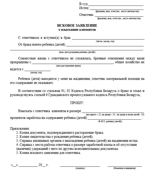 La loi régissant le versement d’une pension alimentaire en Biélorussie prévoit la possibilité de demander le paiement des paiements devant les tribunaux, même s’ils le sont volontairement. En l'absence de tels paiements, c'est le seul moyen de forcer le parent à subvenir aux besoins de l'enfant. La taxe d’état lors du dépôt d’une telle réclamation n’est pas facturée.