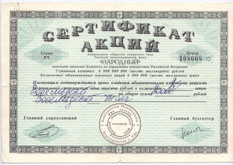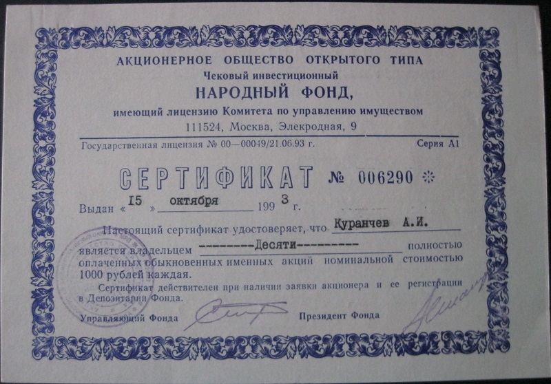 Un fonds d’investissement sous forme de chèques a vu le jour en Russie dans les années 90 en tant qu’instrument économique pour entrer dans l’économie de marché.