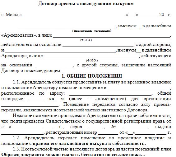 Un contrat de location avec un rachat ultérieur a de nombreux paramètres similaires avec le leasing. À la fin de la durée du contrat, la propriété devient la propriété du locataire. Les caractéristiques de la préparation d’un tel accord sont les suivantes: