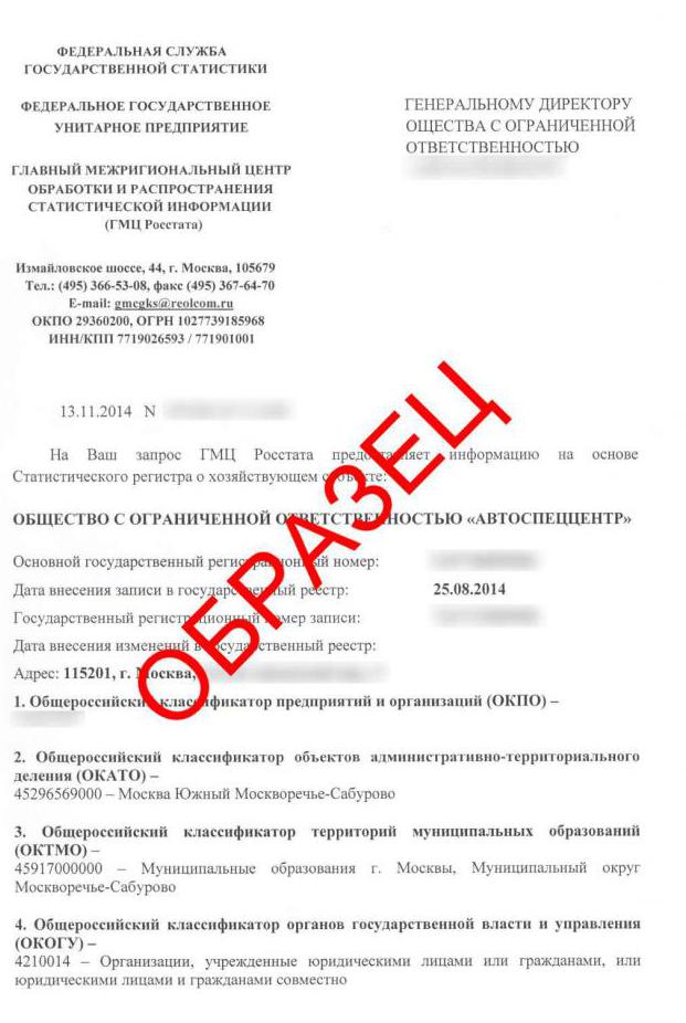 Ainsi, les informations relatives à chaque organisation ayant saisi la comptabilité fiscale sont transmises par le service fédéral des impôts à Rosstat (service statistique fédéral). Ici, les entreprises sont classées selon leur type d'activité, leur localisation territoriale, leur secteur d'activité, etc. Chaque catégorie reçoit un code correspondant.