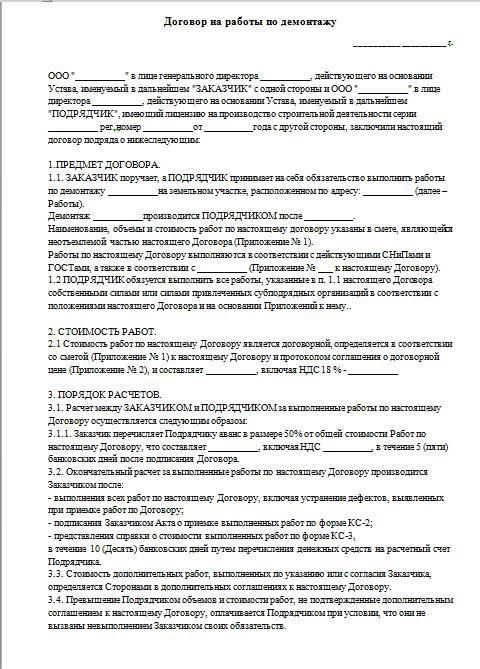 Sans ce document, un projet est impossible. La conclusion d’un contrat formel entre le client et le contractant est une condition préalable au démarrage du démantèlement. C'est un contrat naturellement payé. Il conclut en règle générale à un certain type de travail à une adresse spécifique.