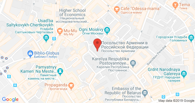 As the official diplomatic mission of Armenia, the embassy of this republic in Moscow is engaged in all aspects of bilateral international relations. At the Armenian Embassy in Russia, there are political, economic, protocol, cultural and consular departments, as well as a humanitarian relations department. The diplomatic mission also has its own press service.