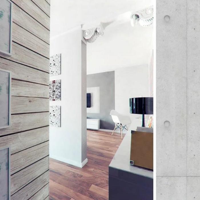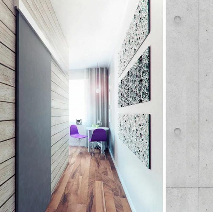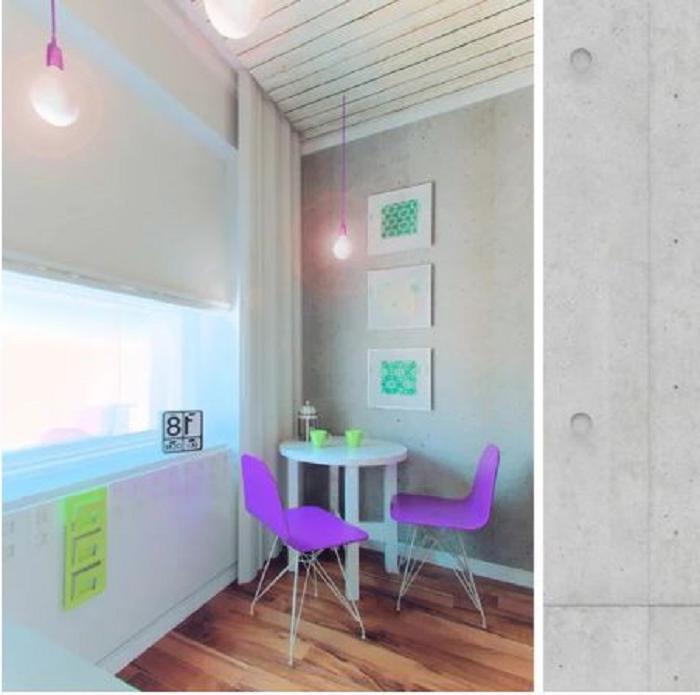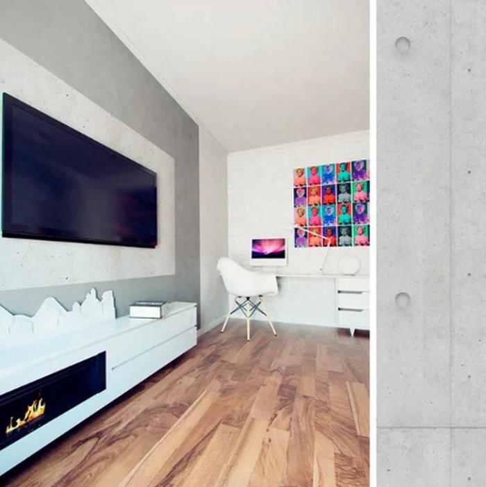 Catherine advises making white the key. Bright rooms seem larger. The rooms in the apartment are separated by a concrete wall, the texture of which resembles raw brick. But not without bright inserts like this multi-colored picture on the wall.