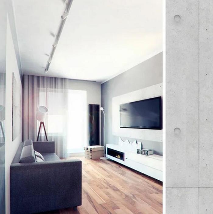 An artificial fireplace under the TV adds even more comfort. Catherine decided not to install doors that would take up a lot of space. She settled on the arches.