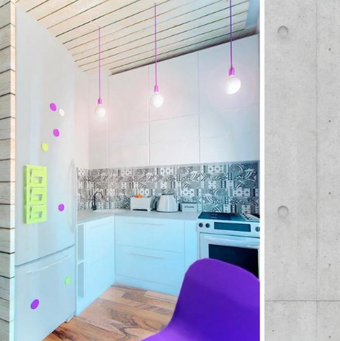 In particular, a corner sink, a compact table and laconic light cabinets were purchased. Not without a bright accent like purple chairs.