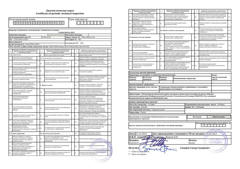 Sur la base des résultats du contrôle, toutes les données sont entrées dans la carte de diagnostic. Ceci est fait électroniquement. Lorsque toutes les places nécessaires dans sept sections sont remplies, les écarts révélés sont indiqués dans le bloc avec les résultats du diagnostic. Ci-dessous, dans un autre bloc, la possibilité ou l'impossibilité de faire fonctionner le véhicule dans son état actuel est indiquée. Une fois le contrôle technique terminé, une carte de diagnostic est imprimée et signée par le conducteur et un expert. C'est estampillé.
