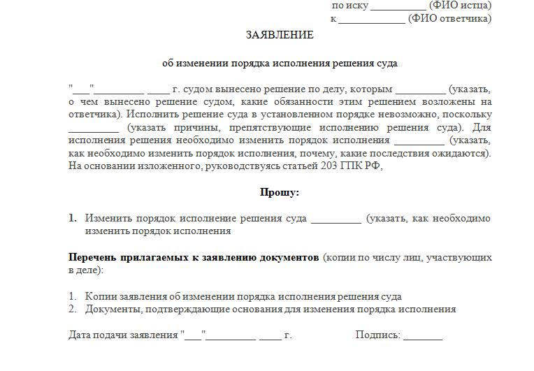 Selon l’article 324 du Code de procédure d’arbitrage, si la partie du débiteur a des circonstances qui empêchent la bonne exécution de la décision de l’autorité judiciaire, l’un des participants à la procédure a le droit de saisir le tribunal en lui demandant de modifier la possibilité de mettre en œuvre ces exigences. Ce document doit être envoyé sur le lieu du procès en première instance.