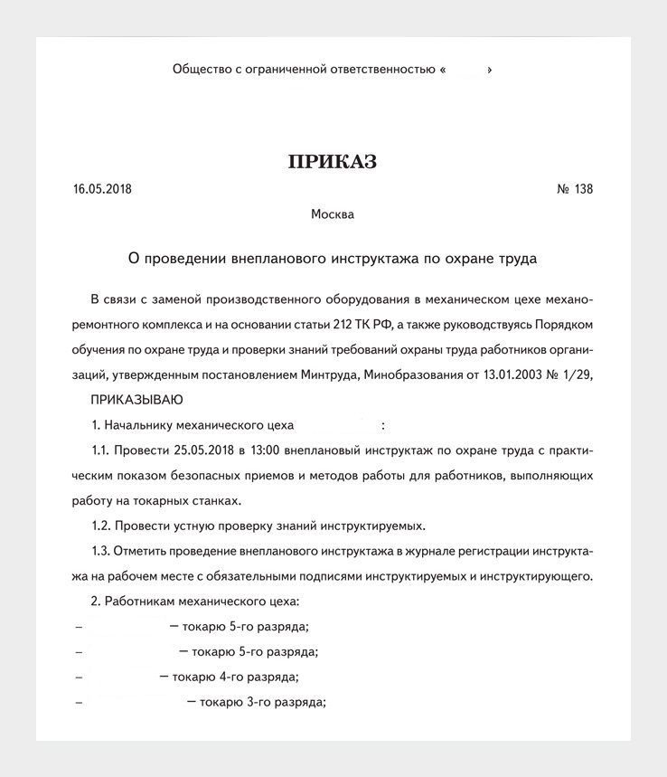 Une feuille spéciale est jointe à cette commande, sur laquelle tous les employés qui doivent suivre une formation sont signés. Ce document confirme que les spécialistes ont été avertis avant le briefing.