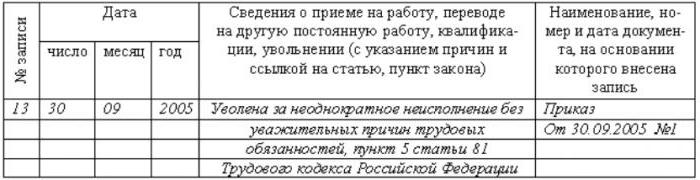 - Faites une entrée dans le cahier de travail de l’employé. Dans notre cas, il s'agit de la clause 6 de l'article 81 du Code du travail de la Fédération de Russie.