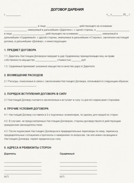 Ainsi, un contrat de donation préalable peut être considéré comme un document contenant les obligations des parties de conclure à l’avenir l’accord principal, qui précise les principales conditions de son application. Un don fait référence à une transaction entre deux ou plusieurs parties, aux termes de laquelle un transfert de propriété gratuit, à savoir un droit de propriété ou un droit de propriété, ou une libération d'obligations de propriété est effectué.