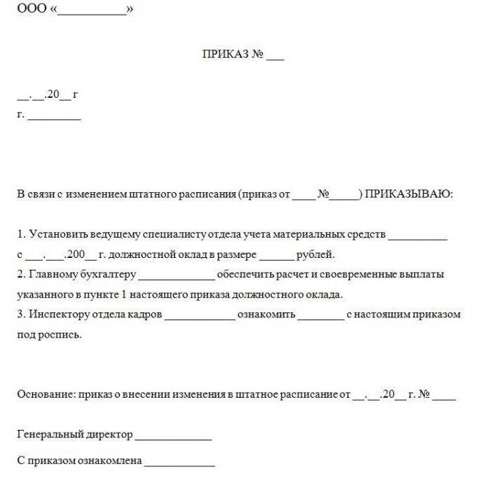 Habituellement, les employés sont d'accord avec les arguments de leurs supérieurs pour éviter de perdre leur emploi. Après avoir obtenu son consentement, le responsable émet un ordre de réduction de salaire, qui contient la liste complète des motifs de la décision. Ici, les modifications convenues sont obligatoires et reflétées (pour un exemple de document, voir ci-dessous).
