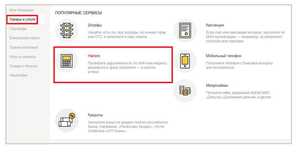 Pour accéder au processus de vérification des taxes avec Yandex.Money, le site Web du service s'ouvre. L'autorisation est effectuée en entrant le nom d'utilisateur et le mot de passe du compte sur Yandex. Vous pouvez trouver la section "Taxes" en utilisant la barre de recherche ou par la séquence de clics "Menu principal", sous-poste "Paiement pour services". La section "Taxes" figure au sous-paragraphe "Logement, services communaux et services publics".
