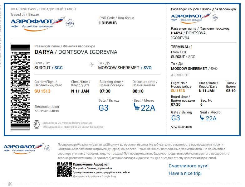 - Nom, prénom, patronyme du passager: Dontsova Daria Igorevna.