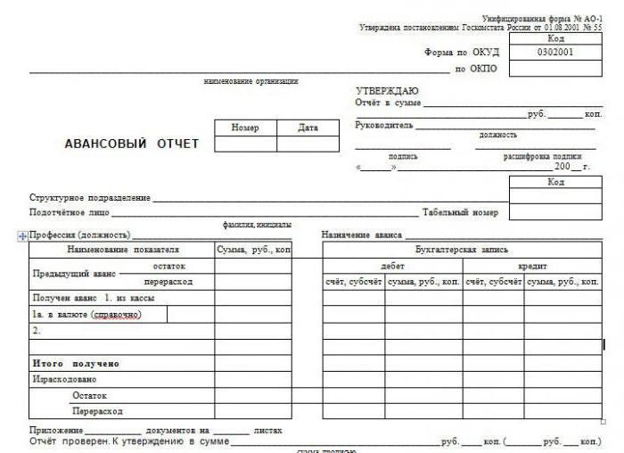 Pour le rapport, il existe un formulaire standard approuvé n ° AO-1. Le document appartient au groupe principal. Une personne responsable est impliquée dans le remplissage du formulaire, c’est-à-dire la personne qui a reçu l’argent pour effectuer la tâche. La tâche de la comptabilité est de vérifier le rapport de dépenses, refléter les écritures dans la comptabilité. Le formulaire contient deux parties: la base, qui reste en mémoire, et le récépissé, transmis à l'employé.