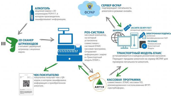 L'acheteur sélectionne le produit souhaité et est prêt à en payer le coût. Après cela, le caissier lit complètement les informations contenues dans le code à barres à l'aide d'un scanner 2D et les marchandises sont interceptées dans le chèque. Simultanément, le programme de caisse génère un fichier XML qui est envoyé au module de transport universel. Ceci est une application spéciale qui échange des informations avec le serveur Rosalkogolregulirovanie. C'est là que sera créé un reçu dans lequel un code à barres et une signature numérique du magasin sont présents, une confirmation est envoyée au caissier, après quoi le chèque peut être fermé. Ainsi, la mise en œuvre de chaque boîte ou bouteille de boissons alcoolisées sera marquée en ligne via EGAIS. L'alcool est contrôlé par l'État via ce système à partir de 2016.