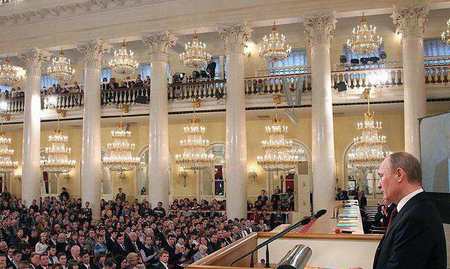 Les résultats de 2015 ont été résumés dans le discours annuel du président Poutine. En pareil cas, l’Assemblée fédérale devrait se réunir dans l’ensemble des deux chambres. Outre le corps législatif principal, il existe d'autres autorités supérieures et des invités de différents niveaux.