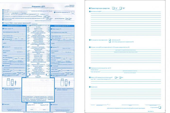 Informations sur comment remplir un avis d'accident de la route, disponible dans le document lui-même et dans n’importe quelle section de la police de la circulation, ainsi que sur de nombreux sites Internet. Il se compose de deux pages. La partie avant doit être remplie directement sur les lieux de l'accident. Il devrait être signé par les deux participants à un accident de la route, ce qui témoignera de leur accord sur ce qui s'est passé. Le verso peut être complété plus tard, lorsque le participant à l'incident aura le temps, mais avant la date limite pour le transfert de tous les documents vers des instances ultérieures.