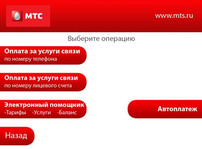 Cela nécessitera un code et un identifiant (émis par le terminal). Sur le site Web, à droite dans "Mon compte", vous devez accéder à la section "Mes paiements automatiques", sélectionner le type de service (communication mobile) et la société (MTS). Ensuite, remplissez le modèle: