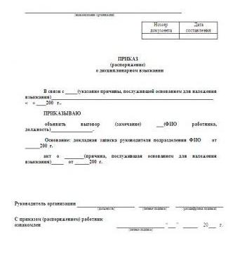 Chaque officier du personnel devrait être en mesure, au moment opportun, d’élaborer un «ordre disciplinaire». Il n'est pas nécessaire que l'échantillon soit sous la forme d'un blanc. Vous devez juste savoir comment refléter correctement ce que dit la loi dans un tel document.