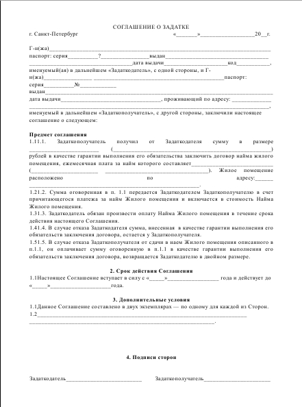 En règle générale, lors de la recherche d'un logement loué pour différentes options, personne ne porte avec lui une somme d'argent décente, ce qui serait suffisant pour payer immédiatement un ou deux mois de loyer. En tant que garantie d'un bail ultérieur, le propriétaire peut laisser un acompte qui sera inclus ultérieurement dans le paiement de l'hébergement.