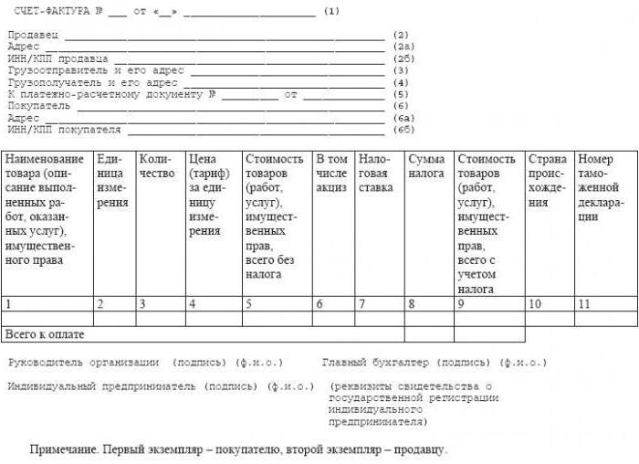 Le remplissage de l'échantillon de facture commence à partir du moment où le document est établi et son numéro de série. Ensuite, le nom du vendeur, de l'acheteur, son adresse légale, le point de contrôle ou le TIN est indiqué. De plus, les adresses et les noms sont entrés conformément à ceux indiqués dans les documents d’enregistrement, c’est-à-dire légaux. Le nom peut être indiqué sous forme abrégée. Si la vente de biens est effectuée à partir des divisions distinctes (OP) du vendeur vers les mêmes divisions de l'acheteur, le point de contrôle de ces OP est indiqué sur la facture.