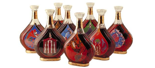 Johnnie Walker: Le Voyage de Delamain aux arômes de peau et de tabac, Martell Creation Cognac dans une carafe en baccara sculptée à la main avec un arrière-goût de marmelade de noix, de vanille douce. Frapin Cuvee 1888 dans une bouteille avec un liège doré, etc.