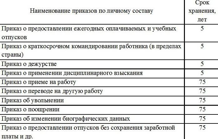 Quelles sont les durées de conservation des ordres du personnel? Il a déjà été dit que beaucoup dépend du type de titres en question. Il existe une documentation pour le stockage à long terme. Il devrait être systématisé et pris en compte conformément aux règles établies. Et ces documents sont stockés pendant une longue période.