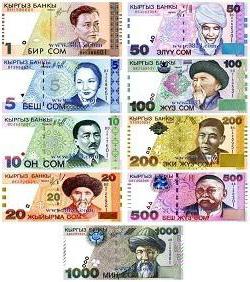 La monnaie du Kirghizistan, d’une valeur faciale de 100 soms, est représentée par le poète national Toktogul Satylganov. Le barrage de Toktogulky était une représentation du revers. Le lac Issyk-Koul, magnifique et apaisant, associé au poète Alykul Osmonov, était situé sur un billet de 200 soms. À 500 soms, vous pouvez voir le poète kirghize Sayakbai Karalaev et le mausolée de Manas. 1000 soms orne le mont Sulayman-Too, sur face avant de l'addition - le poète Zhusup Balasagyn, et la facture de 5 000 dollars est occupée par l'image de l'acteur Suymenkul Chokmorov, connu dans toute l'ex-URSS, et du cinéma Ala-Too.