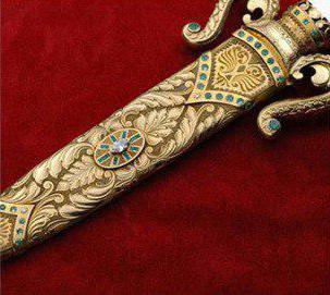 La fierté de cette arme réside non seulement dans les nombreuses pierres précieuses utilisées pour créer et décorer le couteau, mais également dans les motifs inhabituels forgés à la main par l'artisan Baster Warenski. Chacun d’entre eux a été élaboré de la manière la plus minutieuse, les moindres détails et les subtilités des armes décoratives ont été observés.