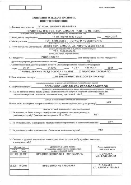 En règle générale, vous pouvez contacter l’employé du service des migrations, qui s’occupe de la réception des documents, après avoir défendu une file d'attente considérable. Tous les documents nécessaires lui sont soumis. En passant, dans chaque corps du FMS, il y a un complexe spécial de photographie, vous ne devez donc pas préparer de photos pour votre passeport à l'avance. En passant, vous pouvez remplir une demande de nouveau passeport en utilisant la technologie informatique électronique. Les données à main levée doivent être écrites en caractères d'imprimerie.