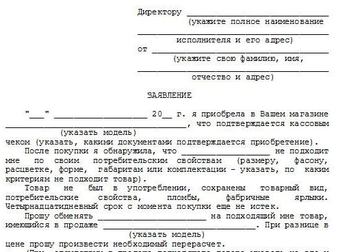 Conformément à la loi sur les droits des consommateurs, l'acheteur dispose de deux options en matière de réparation pour les marchandises de mauvaise qualité. Outre le fait qu'il est obligé de retourner l'argent, l'acheteur peut exiger de remplacer les marchandises par un produit similaire, mais uniquement de haute qualité. Si l'acheteur choisit la deuxième option, la documentation accompagnant le retour de la marchandise reste inchangée. La seule différence réside dans le libellé de l'exigence. Dans ce cas, la déclaration doit indiquer que l'acheteur attend le remplacement de la marchandise et non une compensation monétaire.