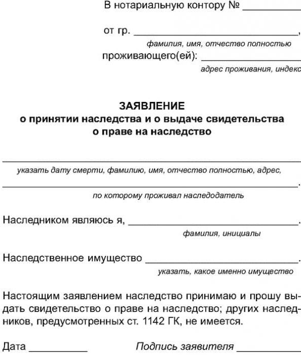 Quelle que soit la méthode d'héritage, vous devrez soumettre une demande au notaire pour saisir l'héritage (un échantillon de celui-ci vous sera présenté ultérieurement). Sinon, la personne perd le droit de recevoir des biens du testateur.