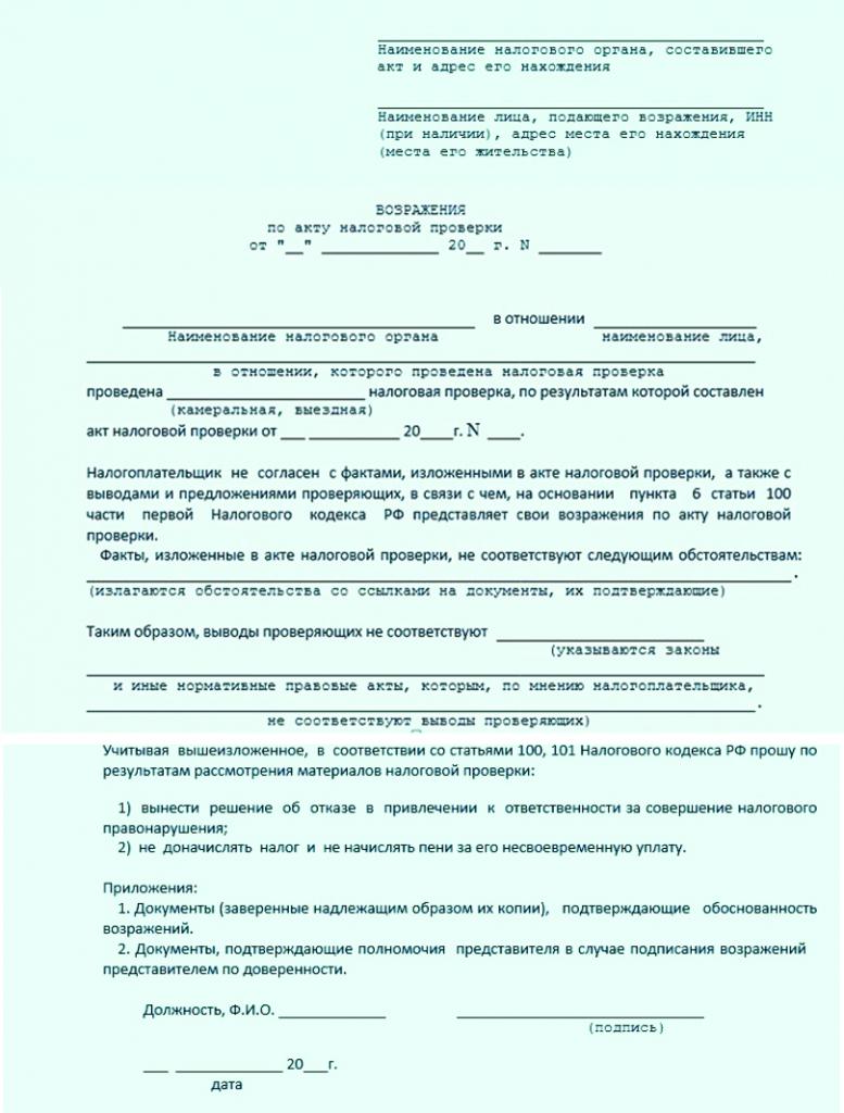 Il n'existe pas de modèle d'objection unique et clairement établi à la loi sur le contrôle fiscal, de sorte que les employés de diverses organisations peuvent générer cette documentation sous forme libre. Pour ce faire, il est tenu compte du type d’inspection effectué, des violations découvertes et du domaine d’activité de la société.
