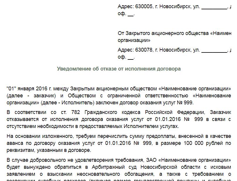 Quelles sont les caractéristiques de la résiliation du contrat sera dans ce cas? L'une des parties a le droit d'envoyer un avis écrit expliquant sa position.L’autre partie n’est pas privée du droit de refuser de résilier le contrat unilatéralement. Une partie qui souhaite mettre fin au contrat peut s'adresser au tribunal.