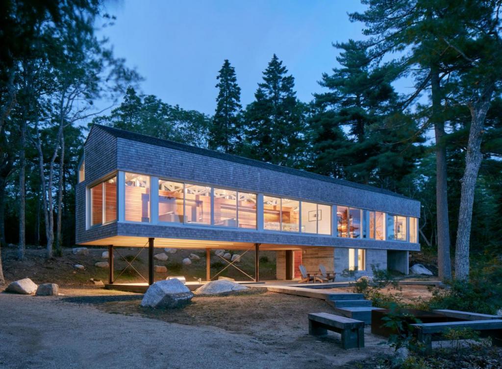 Le Mirror Point Cottage est situé au bord d'un lac, à Annapolis Royal, en Nouvelle-Écosse. Son architecture ressemble à un hangar à poisson typique auquel les pêcheurs gardaient jadis les prises.