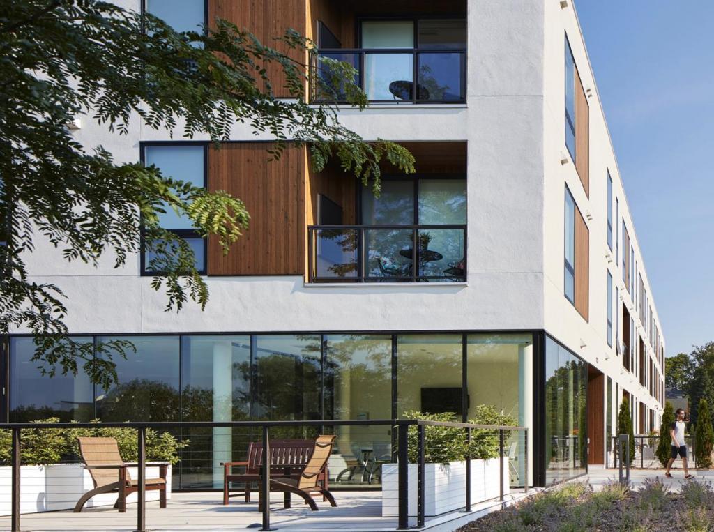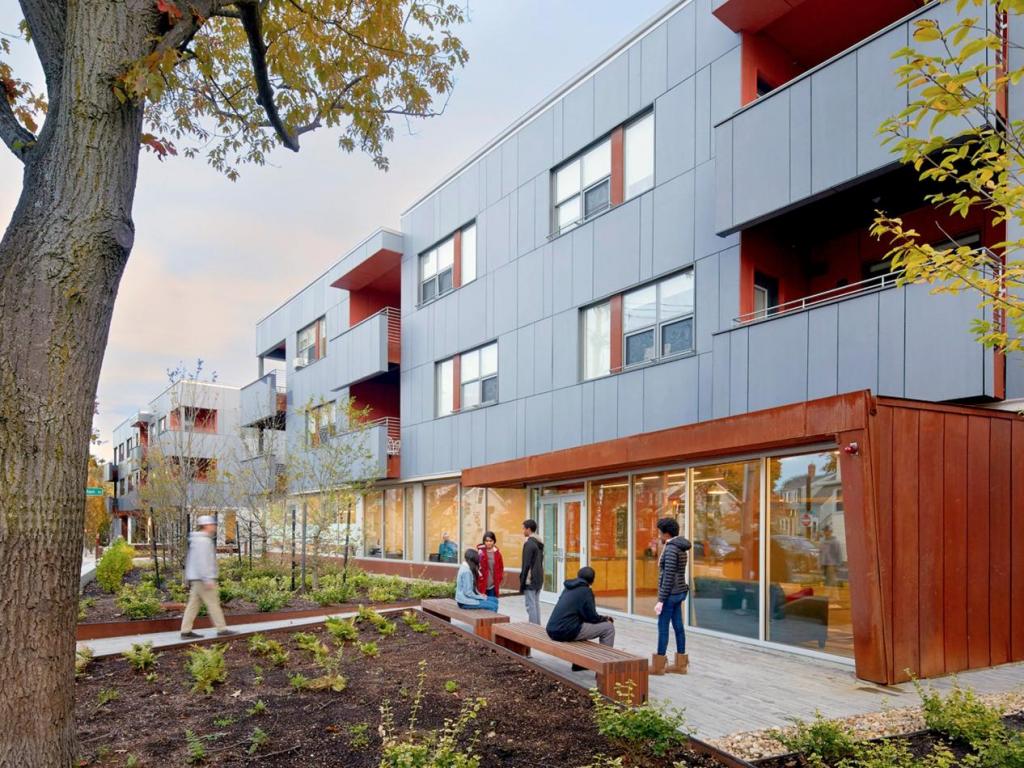 La maison, qui sert de logement abordable aux résidents, a été construite à Cambridge, dans le Massachusetts. Il a quatre cours et de nombreuses terrasses extérieures. Des matériaux naturels et des couleurs vives ont été utilisés pour la décoration.