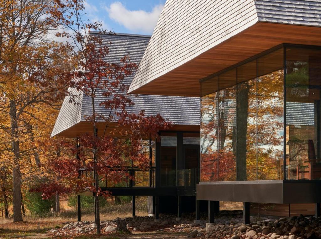 Ils sont organiquement intégrés à l'environnement, en parfaite harmonie avec l'environnement forestier. La partie la plus remarquable de la conception est les toits de tuiles, qui, selon le jury de l'AIA, "flottent sur la ligne du pâturage créé par le cerf dans la forêt".