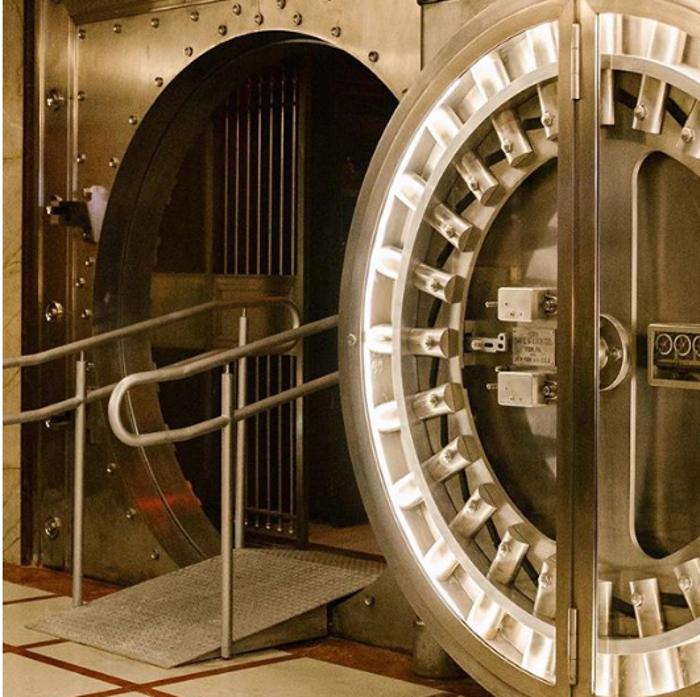 Le premier mur est constitué de 2 000 cellules bancaires, qui étaient auparavant utilisées par les anciens clients des banques pour stocker des documents, des lingots d'or et des bijoux.