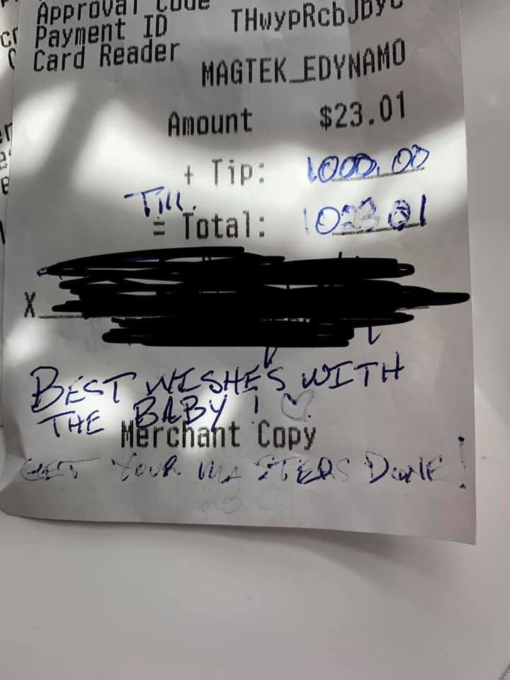 La jeune serveur, qui était dans son cinquième mois de grossesse, travaillait dans un café. Le jour où cette histoire s'est passée, tout s'est passé comme d'habitude. À l'exception du visiteur généreux qui a quitté la future mère, un pourboire de 1 000 dollars, alors que sa facture s'élevait à 23 dollars.