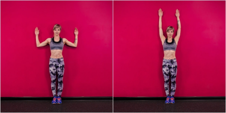 - Glissez vos bras vers le haut et au-dessus de votre tête, puis abaissez-les. Vous pouvez les élever aussi haut ou bas que vous le souhaitez - il est important de les garder contre le mur.