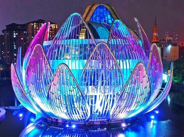 Ce bâtiment (photo principale) est une fleur de lotus, située au milieu d'un lac artificiel dans un parc urbain en Chine et est une agence gouvernementale. Il s’agit d’un complexe entièrement fonctionnel dans lequel se trouvent plusieurs salles de conférence, un département de la planification urbaine. "Lotus" a été construit dans le but d'améliorer l'ambiance des visiteurs à tout moment de l'année, pour leur faire plaisir avec une lumière vive et colorée.