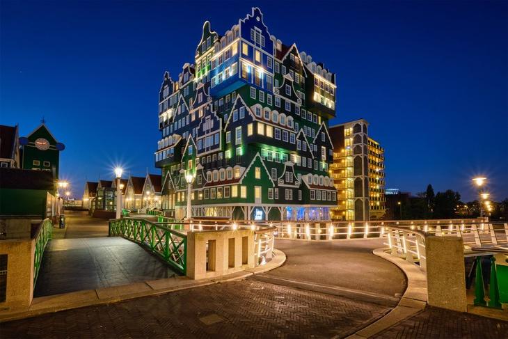 Les maisons en bois vertes avec un revêtement blanc sont une caractéristique traditionnelle de la région de Zandam aux Pays-Bas. Et l’Union des architectes a construit un hôtel qui ressemblait à un groupe de maisons de cette ville, superposées de manière nonchalante. Le design a eu un tel succès que l’hôtel est complet depuis 2016.