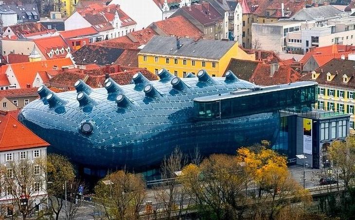 Ce bâtiment ne ressemble-t-il pas à un énorme extraterrestre? Les habitants l'appellent comme ça. Le Kunsthaus est un musée d'art situé à Graz. Il a été construit en 2003.Ce centre culturel présente des expositions d'art contemporain du XXe siècle. La nuit, le côté vitré du bâtiment scintille avec de nombreuses lumières qui ressemblent à de gros anneaux. Cela rend visuellement encore plus grand.