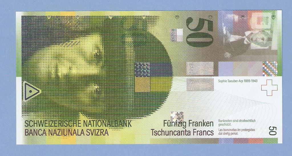 Un billet de banque de 50 francs suisses est unique et porte au dos un autoportrait de l'artiste Sophie Taber-Arp.