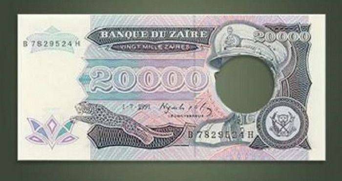 La facture la plus exotique de tous les temps jamais utilisée dans le monde entier. Sur les billets du pays qui portait auparavant ce nom, après le renversement du gouvernement à la suite d'un coup d'État militaire en 1997, l'image de l'ancien dirigeant Joseph Mobuto a été manuellement gravée à l'aide d'un gabarit.
