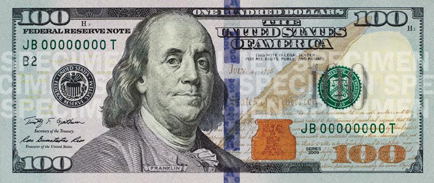 Mais le dernier billet de cent dollars de l'échantillon de 2009 semble plutôt étrange. La bande de sécurité tridimensionnelle violette et les encreurs en terre cuite semblent tout à fait inappropriés dans le contexte du dessin à la retenue classique des billets de banque américains de plus petite valeur. L’absence d’un cadre ovale autour du portrait de la présidente ne l’ornera pas non plus.
