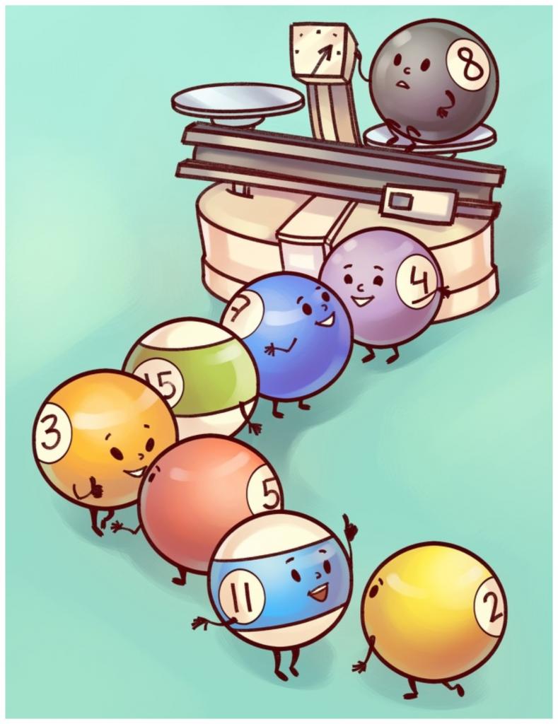Pour comprendre laquelle des boules est la plus lourde, vous devez les diviser en trois parties. Dans deux d'entre eux, il y aura 3 morceaux de balles et dans le dernier - 2 balles. Nous pesons les deux premières parties avec le même nombre de billes. Si l'une d'entre elles pèse plus que la seconde, nous pesons alors n'importe quelle paire de boules de billard. Ainsi, l’une ou l’autre des balles s’avérera être celle que nous recherchons ou ne sera pas pondérée si la paire étudiée a le même poids. Si les parties sont égales, la balle dont nous avons besoin se trouve dans la troisième partie.