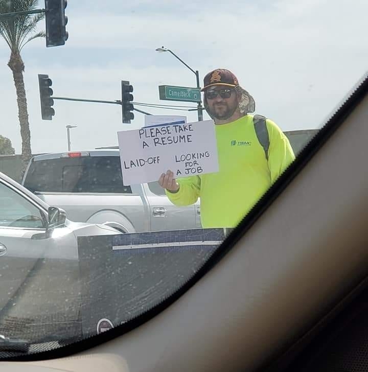 L’homme a imprimé plusieurs copies de son curriculum vitae et a écrit sur un écriteau qu’il cherchait du travail et qu’il était prêt à donner à chacun son intérêt.