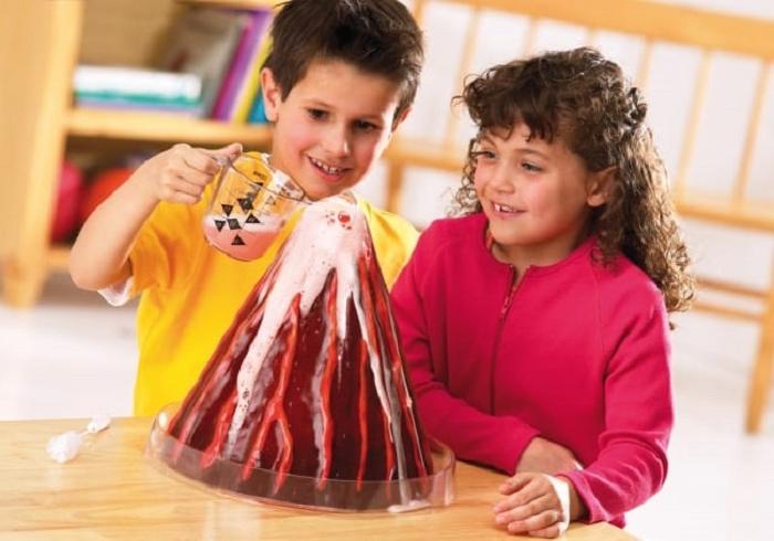 Versez le soda dans un récipient, environ cinq cuillères à soupe, ajoutez de la peinture rouge et de l’eau, puis ajoutez une goutte de liquide vaisselle. Mélangez le tout soigneusement, en versant le mélange obtenu dans la bouche du volcan. Enfin, laissez votre enfant verser de l’acide citrique dans de l’eau sur le volcan. Profitez maintenant de la vue volcanique!